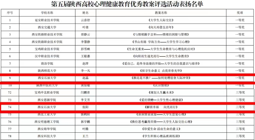 其中,我校學(xué)生工作部(處)(學(xué)生心理成長(zhǎng)指導(dǎo)中心)魏曉言老師、焦文潔老師分別榮獲第九屆陜西高校心理健康教育優(yōu)秀咨詢案例一等獎(jiǎng)和二等獎(jiǎng),趙晶老師、張陽(yáng)老師分別榮獲第五屆陜西高校心理健康教育優(yōu)秀教案評(píng)選一等獎(jiǎng)和三等獎(jiǎng)。由計(jì)算機(jī)學(xué)院姚謙老師和學(xué)生心理成長(zhǎng)指導(dǎo)中心魏曉言老師指導(dǎo)的心理情景劇《你完美的剛剛好》、化學(xué)化工學(xué)院秦嶺老師和學(xué)生心理成長(zhǎng)指導(dǎo)中心趙晶老師指導(dǎo)的心理情景劇《向陽(yáng)而生》分別榮獲第五屆陜西高校校園心理情景劇評(píng)選活動(dòng)一等獎(jiǎng)和三等獎(jiǎng)。由石油工程學(xué)院胡娟、經(jīng)濟(jì)管理學(xué)院何欣月和付鈺冉組成的參賽隊(duì)伍在第六屆陜西高校大學(xué)生心理健康科普知識(shí)競(jìng)賽中榮獲三等獎(jiǎng),該團(tuán)隊(duì)由魏曉言、惠笑吟老師指導(dǎo)。