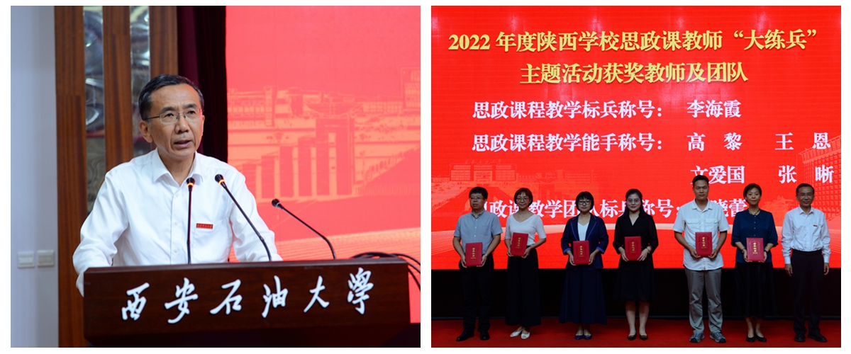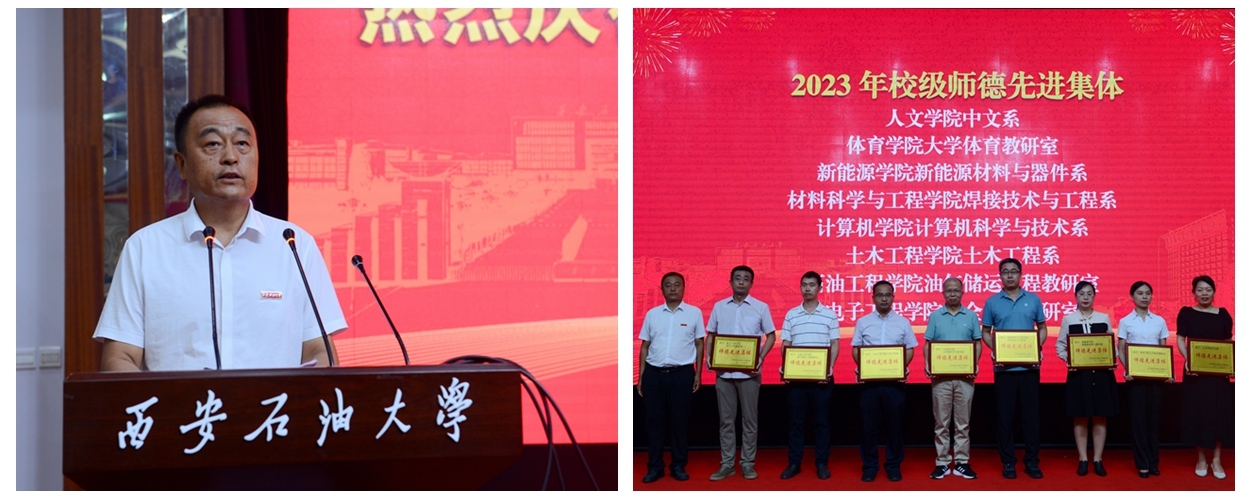 會上,校黨委書記賽云秀宣讀了《教育部關(guān)于公布第三批“全國高校黃大年式教師團隊”創(chuàng)建示范活動入圍名單的通知》《陜西省教育廳關(guān)于公布第二批陜西省高校黃大年式教師團隊的通知》,并為獲獎團隊頒獎;校長李天太宣讀了《教育部關(guān)于公布第二批國家級一流本科課程認定結(jié)果的通知》和2021-2022年度省科學技術(shù)獎獲獎項目名單,并為獲獎團隊和個人頒獎;校黨委副書記、紀委書記、監(jiān)察專員李延平宣讀了《陜西省教育廳關(guān)于表彰第十三屆陜西普通本科高等學校教學名師獎獲獎教師的通知》,并為獲獎教師頒獎;校黨委副書記張木宣讀了《中共陜西省委教育工委 陜西省教育廳關(guān)于對2022年陜西學校思政課教師“大練兵”主題活動中表現(xiàn)突出教師進行表揚的通知》,并為獲獎?wù)哳C獎;副校長楊戰(zhàn)社宣讀了《陜西省科學技術(shù)廳關(guān)于公布2022年度中青年科技創(chuàng)新領(lǐng)軍人才、科技創(chuàng)新創(chuàng)業(yè)人才及2023年度青年科技新星入選人員的通知》,并為入選者頒獎;副校長程永清宣讀了《中共西安石油大學委員會 西安石油大學關(guān)于表彰2023年師德建設(shè)先進集體和師德先進個人的決定》,并為獲獎教師頒獎;副校長張榮軍宣讀了《中共西安石油大學委員會 西安石油大學關(guān)于表彰2023年優(yōu)秀教師 先進教育工作者的決定》,并為獲獎教師代表頒獎;總會計師樊曉民宣讀了《西安石油大學關(guān)于表彰獎勵“教書育人30年”教師的決定》,并為獲獎教師頒獎。