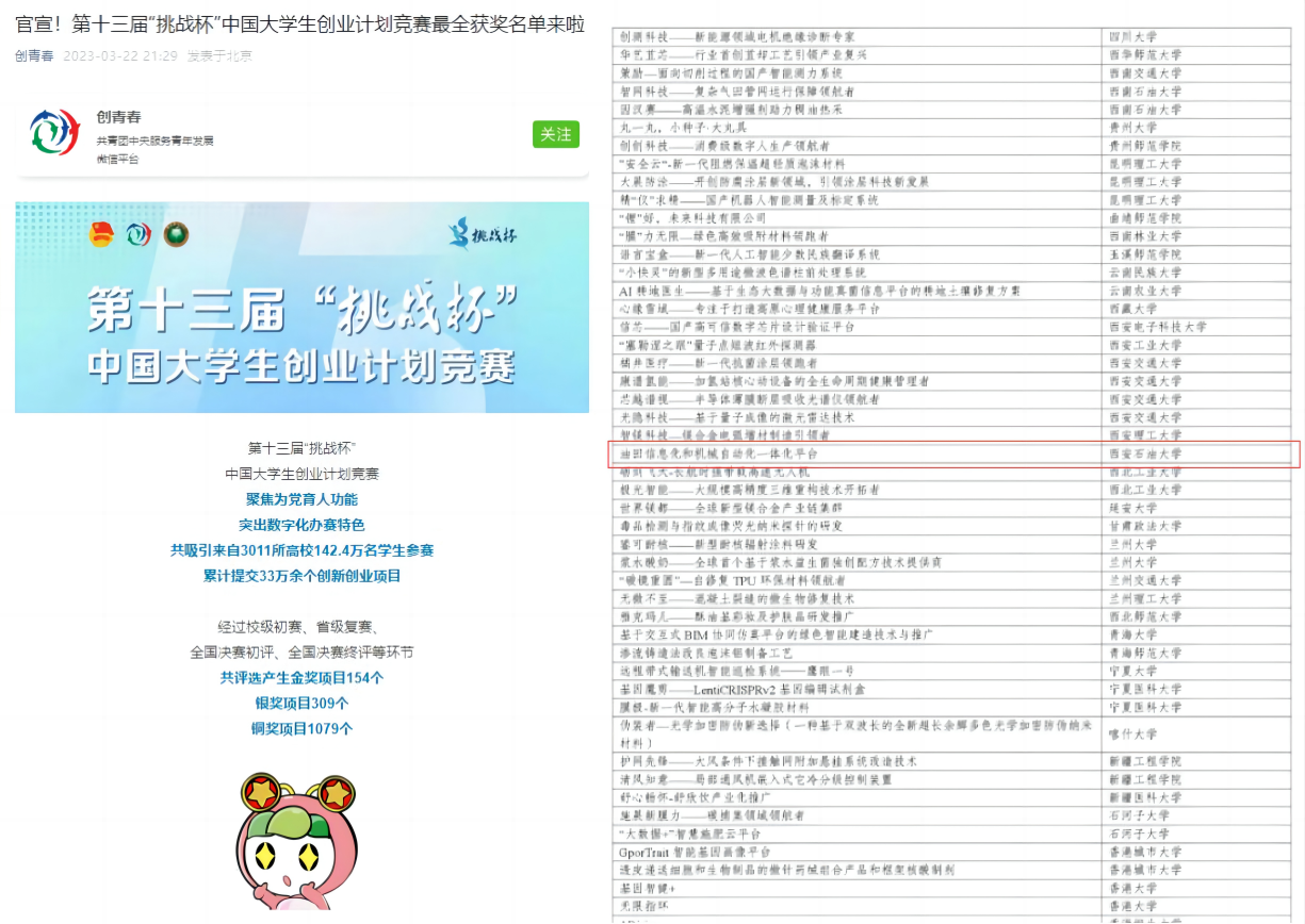 3月17日至19日,第十三屆“挑戰(zhàn)杯”中國大學(xué)生創(chuàng)業(yè)計劃競賽終審決賽在北京理工大學(xué)舉行。經(jīng)過校賽、省賽和國賽角逐,由我校聶向榮、張榮軍、趙凱、楊懿老師指導(dǎo),石工教改2001班梁歡同學(xué)負責(zé)的《油田信息化和機械自動化一體化平臺》項目,榮獲科技創(chuàng)新與未來產(chǎn)業(yè)組別國家級銅獎。