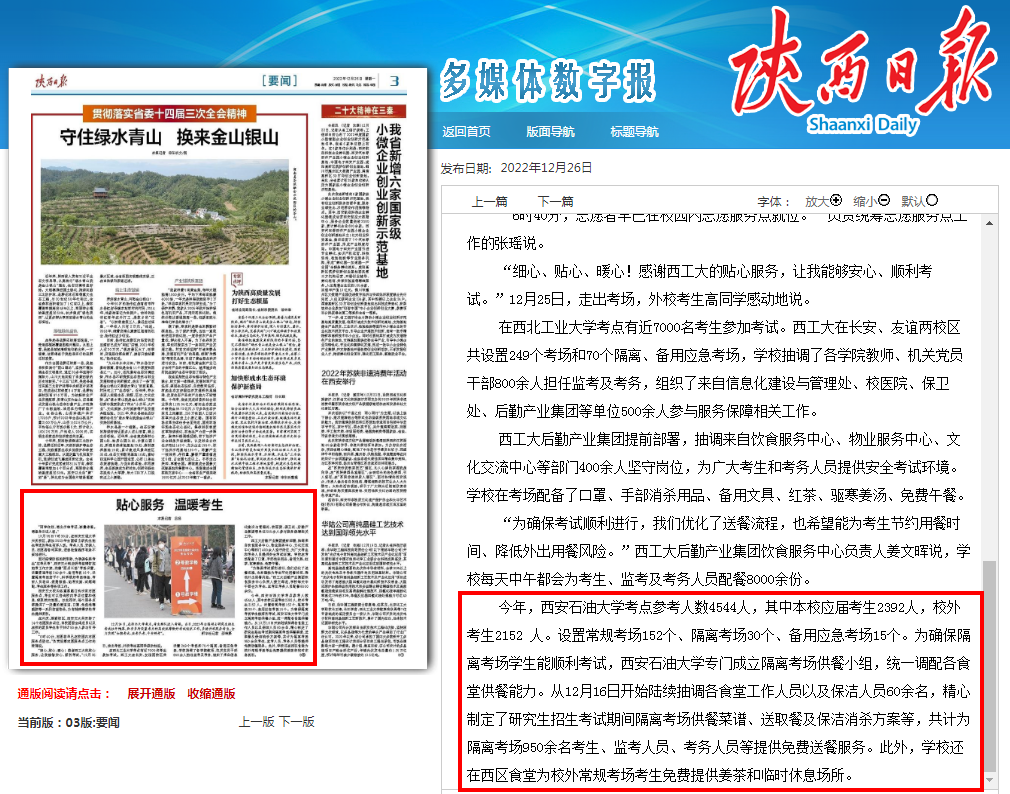 學(xué)校研究生招生考試得到了陜西日報(bào)、陜西廣播電視臺、“學(xué)習(xí)強(qiáng)國”陜西學(xué)習(xí)平臺、澎湃新聞、華商報(bào)、陜西省教育廳官微等省級主流媒體和上級部門的多次報(bào)道,其中,12月25日、26日,陜西日報(bào)兩次報(bào)道學(xué)??紕?wù)工作,取得了較好的社會反響。