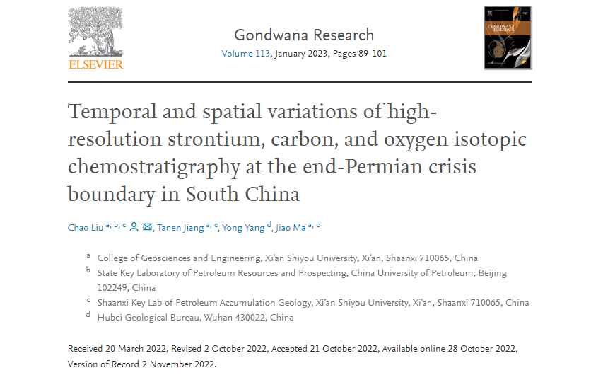 近日,我校地球科學與工程學院教師劉超在國際地學頂級期刊Gondwana Research在線發(fā)表了題為“Temporal and spatial variations of high-resolution strontium, carbon, and oxygen isotopic chemostratigraphy at the end-Permian crisis boundary in South China”的學術論文,探討了二疊系/三疊系之交生物大滅絕的相關重要科學問題。
