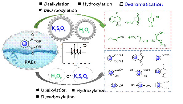 針對(duì)高等氧化方法中單一體系試劑消耗大、去除效率低、反應(yīng)環(huán)境要求高等問題,開發(fā)了一種利用雙氧化劑協(xié)同高效降解頑固污染物鄰苯二甲酸酯的方法。通過簡(jiǎn)單的亞鐵離子激發(fā)經(jīng)濟(jì)和環(huán)境相容的雙氧化劑,達(dá)到“1+1?2”協(xié)同效應(yīng),利用協(xié)同產(chǎn)生物種的可持續(xù)氧化能力,突破PAEs惰性芳環(huán)的轉(zhuǎn)化,實(shí)現(xiàn)高效的去除效率。通過對(duì)比分析鄰苯二甲酸酯非靶向產(chǎn)物,發(fā)現(xiàn)在兩種單一氧化劑體系中的降解通過脫烷基化、羥基加成和脫羧作用,以芳香族化合物為主,而協(xié)同催化氧化體系中DMP能夠突破去芳構(gòu)化作用進(jìn)一步深度氧化為脂肪族分子。氧化過程捕獲的高強(qiáng)度的·OH和SO4?-支持導(dǎo)致雙氧化劑對(duì)DMP可持續(xù)氧化能力以及高效降解作用。這項(xiàng)工作為協(xié)同活化高級(jí)氧化策略去除頑固有機(jī)污染物提供重要的思路與展望。