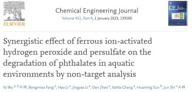近日,我?;瘜W(xué)化工學(xué)院吳亞副教授、史俊教授在化工領(lǐng)域TOP期刊Chemical Engineering Journal( IF 16.744 )上在線發(fā)表了題為“Synergistic Effect of Ferrous Ion-Activated Hydrogen Peroxide and Persulfate on the Degradation of Phthalates in Aquatic Environments by Non-target Analysis”的研究文章(DOI:10.1016/j.cej.2022.139100)。