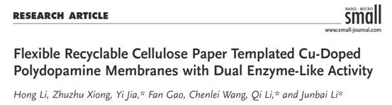 近日,我?;瘜W(xué)化工學(xué)院李紅教授課題組在聚多巴胺基仿生酶構(gòu)建研究方面取得了重要進展,相關(guān)工作分別發(fā)表在Small(中科院一區(qū),IF=15.153)和Journal of Colloid and Interface Science(中科院一區(qū),IF=9.965)期刊上。該課題組報道了一種以氧化纖維素為模板銅摻雜聚多巴胺膜的構(gòu)建方法。制備得到以氧化纖維素為載體、以銅離子為活性中心的薄膜,其具有兩種天然酶類似的活性,包括漆酶和過氧化物酶。薄膜能夠有效地將對苯二酚催化形成苯醌,催化效率是天然漆酶的3倍。并且,該薄膜具有類似過氧化物酶的活性,能夠催化過氧化氫對3,3',5,5'-四甲基聯(lián)苯胺的氧化反應(yīng),生成藍色的氧化產(chǎn)物,進而應(yīng)用于過氧化氫和抗壞血酸的靈敏檢測。與天然酶相比較,仿生酶還具有成本低、易于儲存和運輸、穩(wěn)定性好及可循環(huán)使用等優(yōu)點。相關(guān)成果以“Flexible Recyclable Cellulose Paper Templated Cu-Doped Polydopamine Membranes with Dual Enzyme-Like Activity”為題發(fā)表在化學(xué)權(quán)威期刊Small上(DOI: 10.1002/smll.202202405)。
