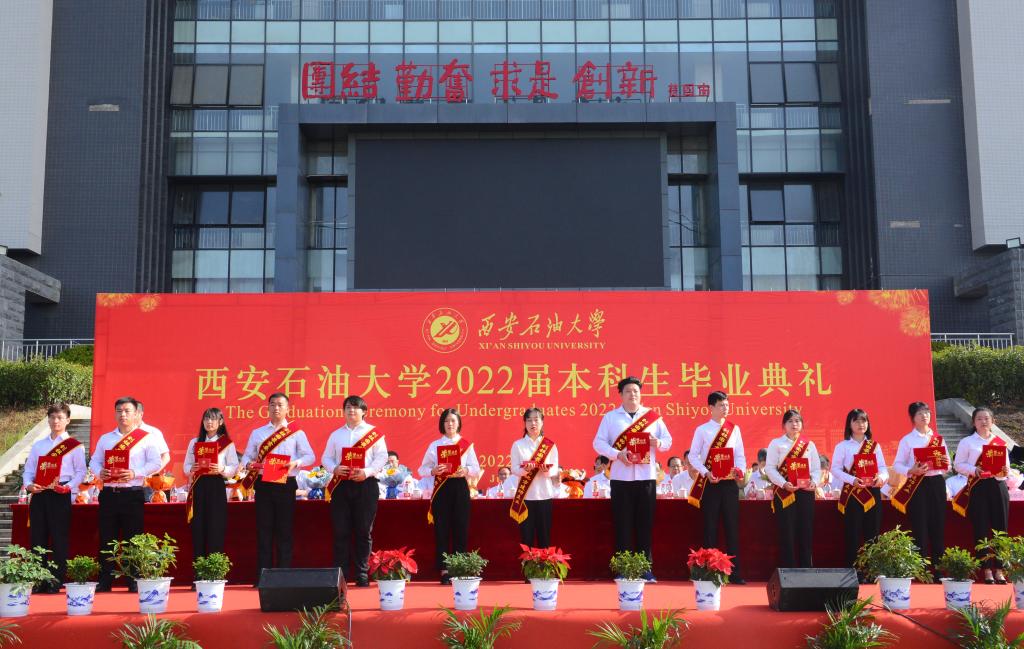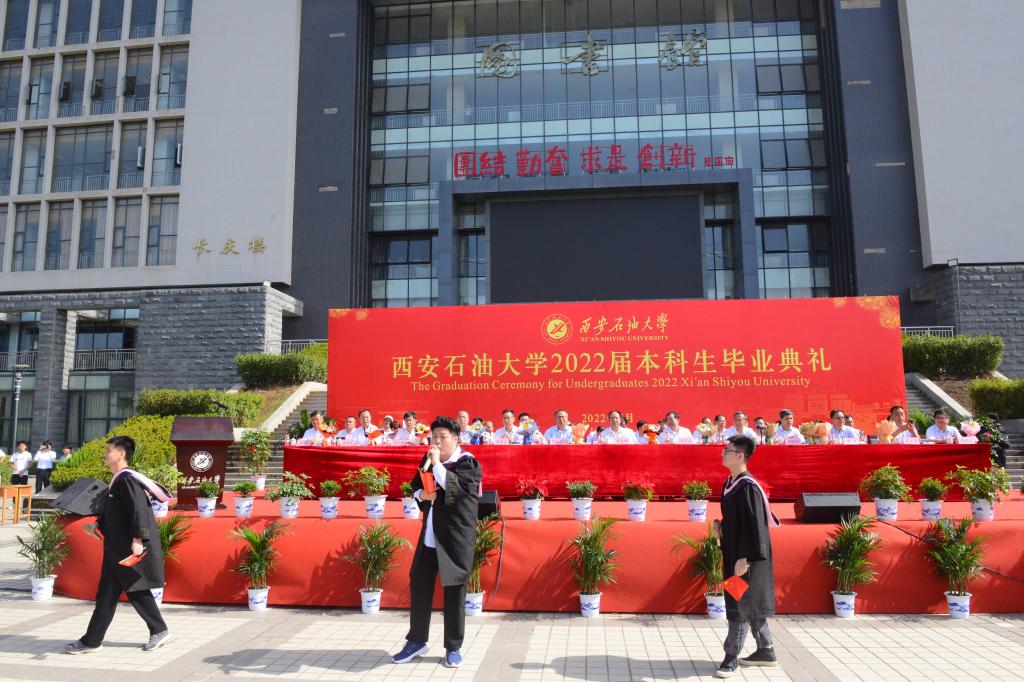 副校長(zhǎng)陳軍斌宣讀了《西安石油大學(xué)關(guān)于2022屆本科學(xué)生準(zhǔn)予畢業(yè)、頒發(fā)畢業(yè)證和授予學(xué)士學(xué)位的決定》,副校長(zhǎng)楊戰(zhàn)社宣讀了《西安石油大學(xué)關(guān)于表彰2022屆優(yōu)秀畢業(yè)生的決定》,校黨委副書(shū)記雷西合宣讀了《西安石油大學(xué)校友總會(huì)關(guān)于聘任2022屆年級(jí)校友理事的決定》。與會(huì)校領(lǐng)導(dǎo)為志愿服務(wù)西部計(jì)劃、榮獲優(yōu)秀畢業(yè)生榮譽(yù)稱號(hào)的學(xué)生代表頒發(fā)了榮譽(yù)證書(shū)并贈(zèng)送了“原油”印章紀(jì)念品,為年級(jí)理事代表頒發(fā)了聘任證書(shū)和紀(jì)念品。