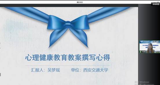 第三屆陜西高校心理健康教育教案評(píng)選一等獎(jiǎng)獲得者西安交通大學(xué)吳夢(mèng)瑤、空軍軍醫(yī)大學(xué)2021年度“十佳優(yōu)秀教案”獲得者吳迪兩位老師結(jié)合各自的獲獎(jiǎng)教案分享了《心理健康教育教案撰寫(xiě)心得》以及《教案書(shū)寫(xiě)的心得與體會(huì)》,他們優(yōu)秀的教案讓參會(huì)者們看到了一線老師對(duì)待教學(xué)的用心、精心、恒心。