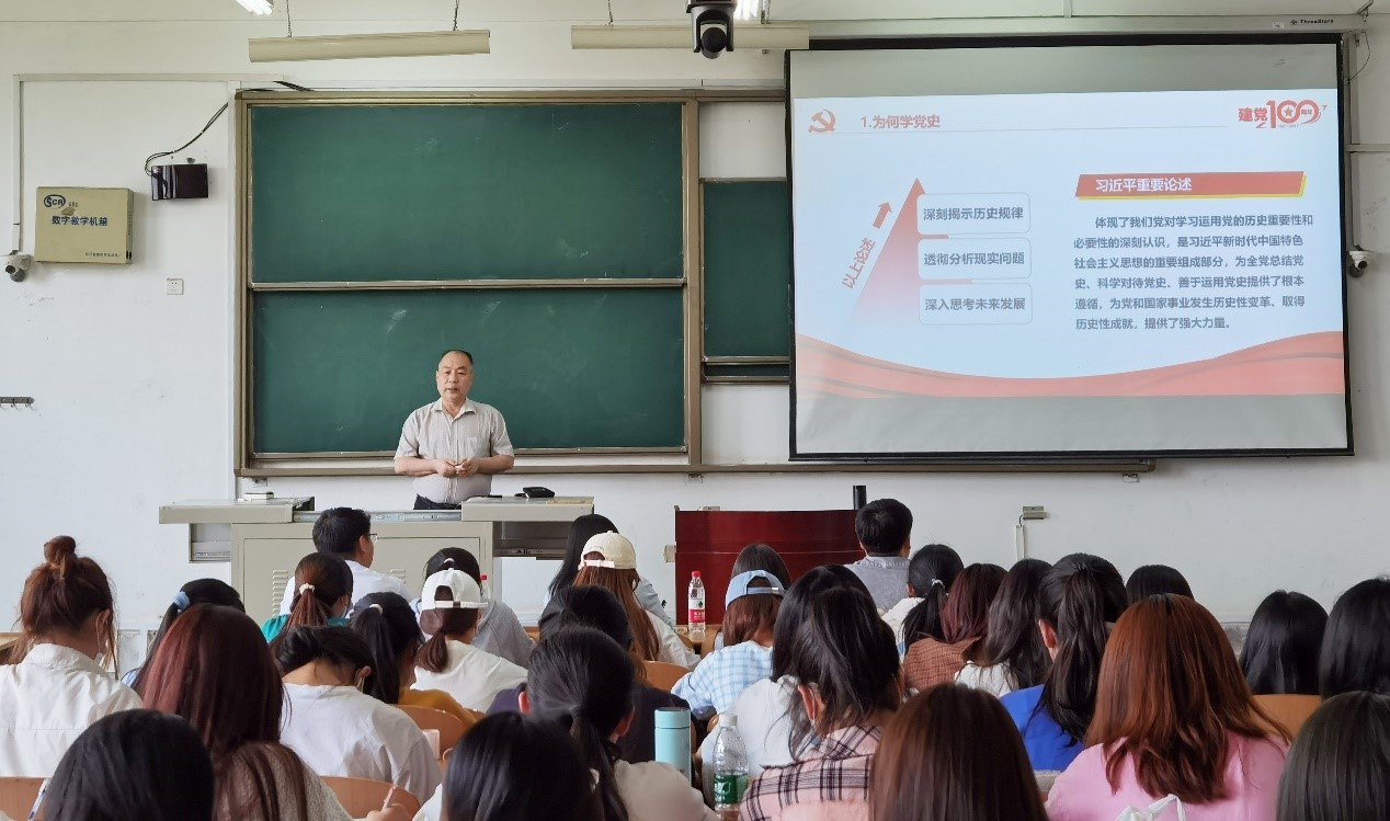 授課中,陳軍斌以開展黨史學(xué)習(xí)教育的重大意義為引,從“學(xué)習(xí)黨史的重要性與方法論”“中國共產(chǎn)黨的百年奮斗歷程”“百年黨史昭示中國共產(chǎn)黨為什么‘能’”三個(gè)方面展開講授。系統(tǒng)講述了黨史學(xué)習(xí)的三個(gè)“必然要求”,進(jìn)一步感悟思想偉力、把握歷史發(fā)展規(guī)律和大勢、深化對黨的性質(zhì)宗旨的認(rèn)識、總結(jié)黨的歷史經(jīng)驗(yàn)五個(gè)方面的黨史學(xué)習(xí)方法論。以“一條主線”“三大飛躍”“四個(gè)階段”帶領(lǐng)師生學(xué)習(xí)了黨的百年奮斗歷程,回顧了黨的十九次代表大會(huì)召開情況及歷史意義。并從“科學(xué)的理論指導(dǎo)”“堅(jiān)定的理想信念”“ 強(qiáng)大的組織優(yōu)勢”“堅(jiān)實(shí)的群眾基礎(chǔ)”“徹底的自我革命”五個(gè)方面深刻闡述了“中國共產(chǎn)黨為什么‘能’”。他指出,歷史充分證明,只有社會(huì)主義才能發(fā)展中國,只有中國共產(chǎn)黨才能帶領(lǐng)全體中華兒女實(shí)現(xiàn)中華民族偉大復(fù)興。他強(qiáng)調(diào),黨的百年奮斗歷程蘊(yùn)含了中國共產(chǎn)黨為什么“能”的思想密碼,是一座資政育人、繼往開來的豐富礦藏,勉勵(lì)師生深入學(xué)習(xí)黨的歷史,從百年黨史中賡續(xù)紅色基因、傳承革命薪火,堅(jiān)定理想信念,夯實(shí)信仰之基,勇?lián)鷷r(shí)代使命,鍛造過硬本領(lǐng)。