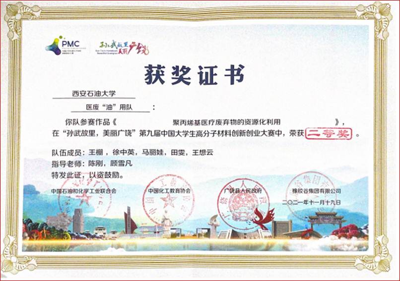 基于該課題的研究工作,已經(jīng)先后獲得第十四屆全國大學生節(jié)能減排社會實踐與科技競賽三等獎、第九屆中國大學生高分子材料創(chuàng)新創(chuàng)業(yè)大賽二等獎。