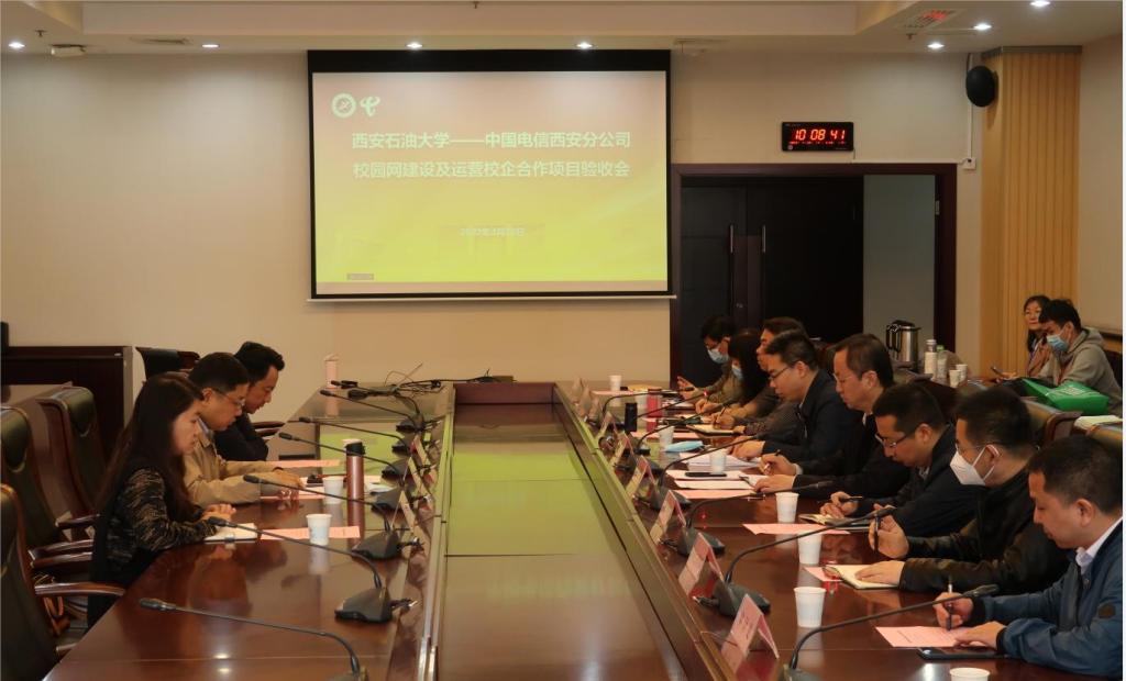 4月28日上午,學(xué)校在鄠邑校區(qū)圖書館第二會議室召開“西安石油大學(xué)—中國電信股份有限公司西安分公司 校園網(wǎng)建設(shè)及運營校企合作項目”驗收會。學(xué)校網(wǎng)絡(luò)安全與信息化工作領(lǐng)導(dǎo)小組副組長、副校長張榮軍,中國電信股份有限公司西安分公司副總經(jīng)理楊帆出席會議,學(xué)校黨政辦公室、學(xué)生工作部(處)、保衛(wèi)部(處)、審計處、財務(wù)處、國有資產(chǎn)處、資產(chǎn)經(jīng)營處、基建處、后勤處等學(xué)校網(wǎng)絡(luò)安全與信息化工作領(lǐng)導(dǎo)小組成員單位負責(zé)人以及西安電信校園運營中心總經(jīng)理王建成、總監(jiān)楊莎莎參加會議,會議由信息中心主任王學(xué)龍主持。