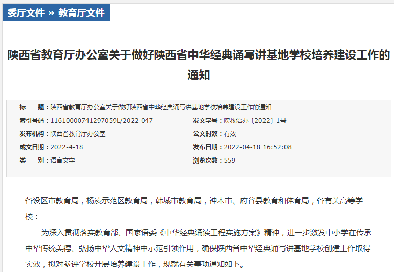 4月18日,陜西省教育廳辦公室發(fā)布了《關(guān)于做好陜西省中華經(jīng)典誦寫(xiě)講基地學(xué)校培養(yǎng)建設(shè)工作的通知》(陜教語(yǔ)辦〔2022〕1號(hào)),我校成功獲批陜西省“中華經(jīng)典誦寫(xiě)講基地”培養(yǎng)建設(shè)高校。