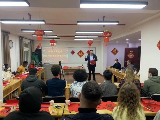 活動中,國際教育學院王朝暉老師用中英雙語和精彩細致的圖文講解為大家介紹了中國春節(jié)習俗,現(xiàn)場寫對聯(lián)、寫“?!弊郑寚H學生通過親手書寫的“?!弊?,感受中國春節(jié)文化習俗,表達新春美好祝福。同學們拿著自己書寫的大大的“?!弊郑徒o老師,送給自己的朋友,貼在自己房門上,共迎新年的到來。