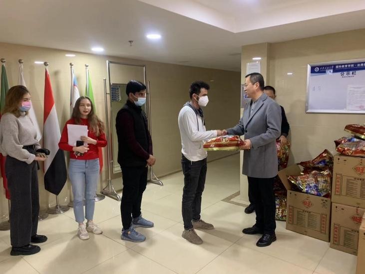 張榮軍副校長在向國際學生的新年致辭中表示,在剛剛過去的近一個月,留學生和學校的老師們、醫(yī)護人員、后勤保障人員等一起,堅守公寓,足不出戶,共同努力取得了新冠肺炎狙擊戰(zhàn)的完全勝利。向疫情期間為留學生疫情防控工作付出艱辛努力的醫(yī)護人員、防控工作人員、物資保障人員、安保執(zhí)勤人員及國際學院工作人員等表示崇高的敬意,也向疫情期間全體留學生積極配合表示衷心的感謝。隨后,張榮軍副校長代表學校分別向疫情防控國際學生志愿者、留校國際學生代表、國際學生公寓假期執(zhí)勤人員等發(fā)放了春節(jié)慰問品。