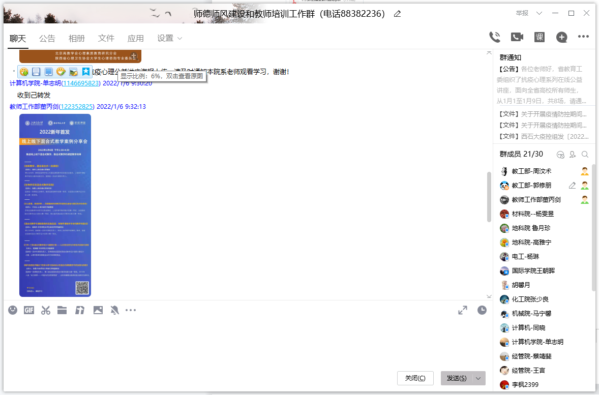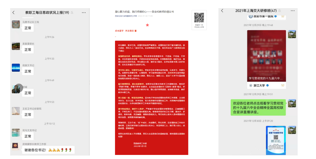 思想政治教育全覆蓋,強化教職工思想引領(lǐng)。建立學(xué)校教職工思想政治狀況信息群,各院(系)級單位黨組織書記在群內(nèi)每天上報本單位教職工思想政治狀況,精準(zhǔn)排查不漏一人,加強觀測引導(dǎo),對全校教職工思想政治狀況切實做到底子清、情況明、措施實。發(fā)出《致全校教師的倡議書》,組織教師線上觀看學(xué)習(xí)貫徹黨的十九屆六中全會精神全國高校聯(lián)合宣講直播講座,在部門所屬各教師群內(nèi)轉(zhuǎn)發(fā)疫情防控法律法規(guī),教育教師在學(xué)校做好老師,在社區(qū)做好公民。