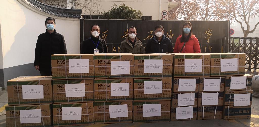 1月3日,經我??倳嫀煼畷悦衤?lián)系,中國銀行西安二環(huán)世紀星支行為我校捐贈一批疫情防控物資,其中包含N95醫(yī)用防護口罩10300只,酒精225升。