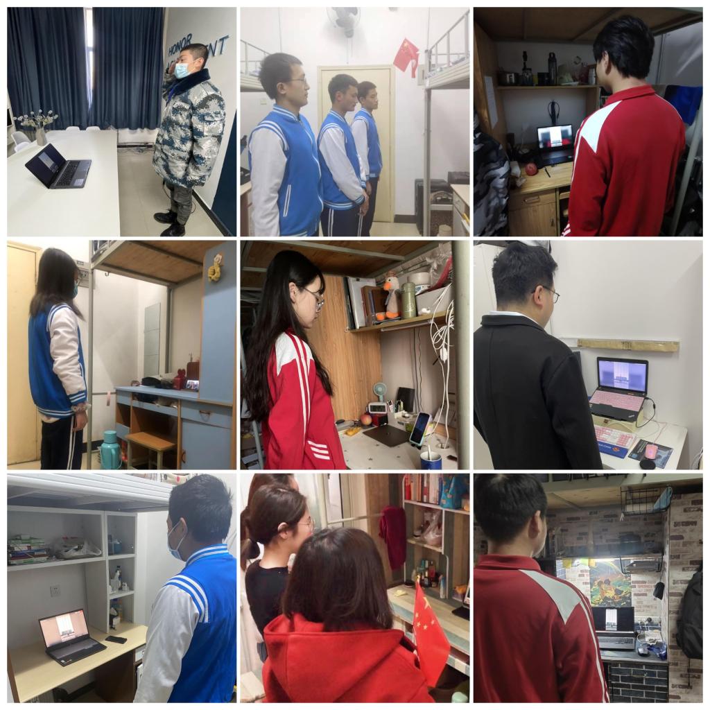 紅日初升,其道大光。清晨7點(diǎn)半,師生們就陸續(xù)進(jìn)入直播間,等候著國旗升起的莊嚴(yán)時(shí)刻。8時(shí)整,在全校師生的深情注目下,升國旗儀式正式開始,國旗護(hù)衛(wèi)隊(duì)的同學(xué)邁著整齊劃一、鏗鏘有力的步伐從學(xué)校廣場出發(fā),護(hù)送著國旗正步走向旗桿。伴隨著莊嚴(yán)的《國歌》,國旗護(hù)衛(wèi)隊(duì)隊(duì)員將鮮艷的五星紅旗高高托舉,緩緩地升至最高點(diǎn)。在屏幕前的同學(xué)們懷著崇敬的心情,在宿舍站立,共唱國歌、行注目禮,深懷對(duì)祖國和人民的無限熱愛與戰(zhàn)勝本次疫情、攻堅(jiān)克難的堅(jiān)定信心。