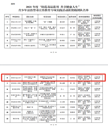 近日,根據共青團陜西省委員會下發(fā)文件《關于確定2021年度“防范毒品濫用 共享健康人生”青少年法治禁毒宣傳教育專項實踐活動獲資助團隊的通知》,我?!皥远ń静凰尚感》株牎鄙鐣嵺`團被確定為專項實踐活動資助項目。
