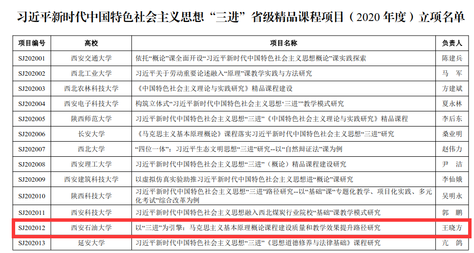近日,省委教育工委發(fā)布了《中共陜西省委教育工委關(guān)于習(xí)近平新時代中國特色社會主義思想“三進”省級精品課程項目(2020 年度)立項的通知》,全省共有25項課程項目予以立項。我校馬克思主義學(xué)院王曉方教授申報的《以“三進”為引擎:馬克思主義基本原理概論課程建設(shè)質(zhì)量和教學(xué)效果提升路徑研究》入選立項名單。