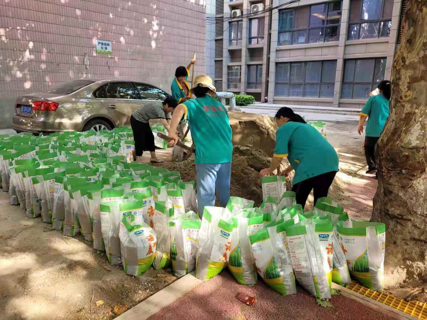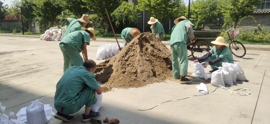 物業(yè)人員檢查、裝填防汛沙袋