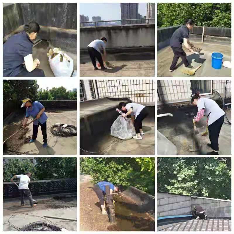 工作人員在各樓宇樓頂屋面、排水(落水)管口進(jìn)行雜物清掏