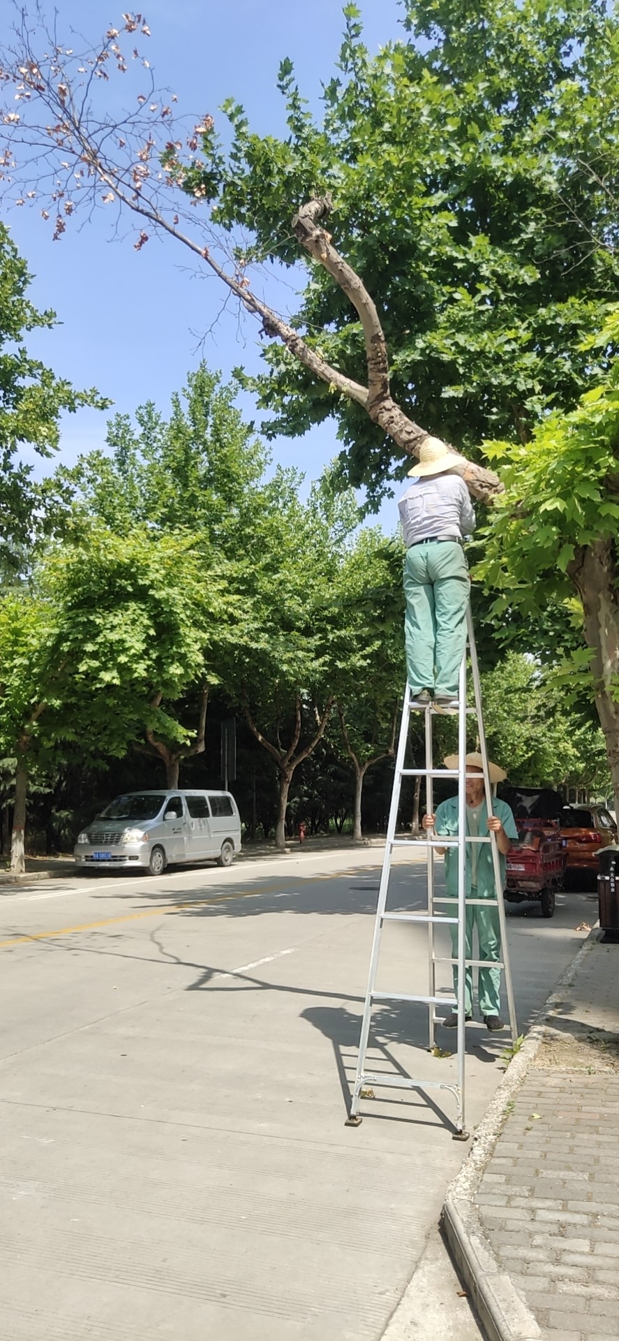 組織人員進(jìn)行校園內(nèi)喬木病害枝條的修剪