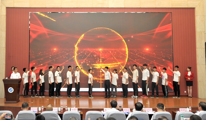 校黨委副書記張木宣布喜迎70周年校慶校旗傳遞活動啟動,并為儲運2000級校友、學校校友企業(yè)家聯(lián)合會秘書長李廣濤授校旗。副校長張榮軍啟動喜迎70周年校慶校旗線上傳遞活動。