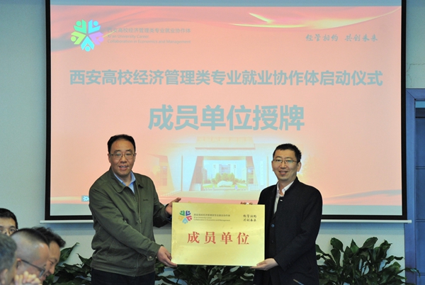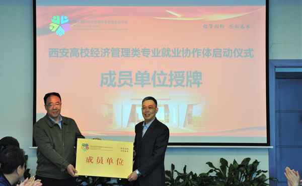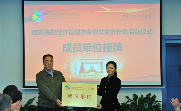 陜西省教育廳高校學(xué)生工作處二級(jí)調(diào)研員胡偉安依次為西安高校經(jīng)濟(jì)管理類專業(yè)就業(yè)協(xié)作體成員單位西安石油大學(xué)、西北政法大學(xué)、西安外國語大學(xué)、西安財(cái)經(jīng)大學(xué)、西安郵電大學(xué)授牌。