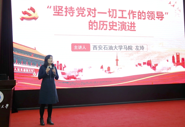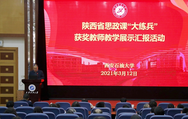 為深入學習貫徹習近平總書記在學校思想政治理論課教師座談會上的重要講話精神,促進思政課程和課程思政有機融合,3月12日下午,我校在雁塔校區(qū)學術(shù)報告廳舉辦首場陜西省思政課“大練兵”獲獎教師教學展示匯報活動。校黨政領(lǐng)導賽云秀、張木、陳軍斌、程永清出席活動。馬克思主義學院左玲、石少虎、程麗玥、鄭偉四位思政課“大練兵”獲獎教師,相關(guān)職能處室負責人,理學院、外國語學院等5個院系負責人和教師代表參加。程永清主持本次教學展示活動。