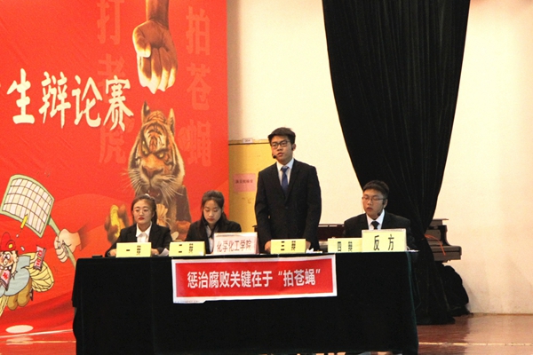 外國語學院和化學化工學院兩支代表隊以“懲治腐敗關鍵在于‘打老虎’還是‘拍蒼蠅’”為辯題,展開了辯論,唇槍舌劍,精彩紛呈。在場下觀眾提問環(huán)節(jié),在場的同學們也積極參與了辯論。最終,外國語學院獲得第二十屆“智者杯”辯論賽冠軍,化學化工學院獲得亞軍,石油工程學院和電子工程學院獲得季軍。馬克思主義學院副院長張海濤代表評委團對冠軍爭奪賽作了點評。他談到,在懲治腐敗中,“打老虎”和“拍蒼蠅”同等重要,辯題的設置體現(xiàn)了唯物史觀視域下堅持“兩點論”和“重點論”的辯證統(tǒng)一,對同學們深刻理解“不敢腐、不能腐、不想腐”的體制機制建設,牢固樹立廉潔自律意識具有重要意義。