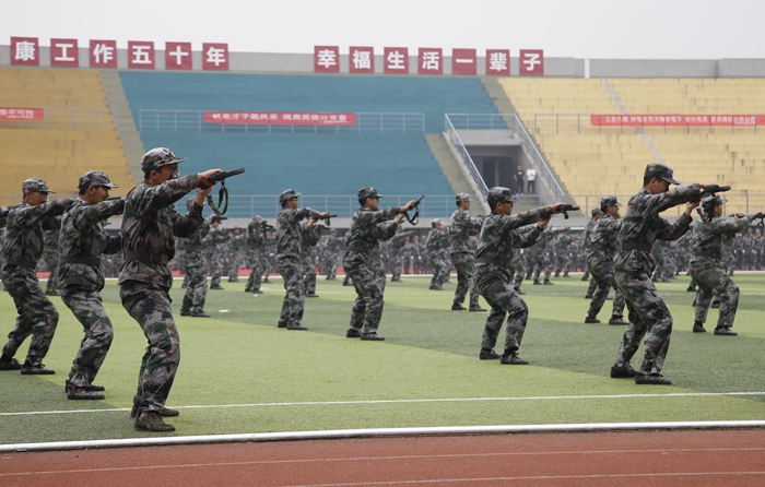 伴隨著激昂的進(jìn)行曲和嘹亮的口號(hào),2020級(jí)本科生分12個(gè)方陣,邁著整齊矯健的步伐,精神飽滿地經(jīng)過主席臺(tái),向全校師生展示隊(duì)列訓(xùn)練成果。隊(duì)列成果展示后,2020級(jí)本科新生分別進(jìn)行了捕俘刀、軍體拳、刺殺操、手語操等科目的表演。