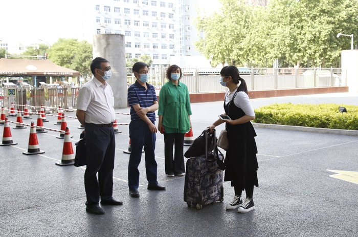 學(xué)校領(lǐng)導(dǎo)到報(bào)到區(qū)迎接返校同學(xué),對返校同學(xué)表示歡迎,希望同學(xué)們返校之后繼續(xù)做好自我防護(hù),珍惜在校時(shí)光,安排好自己的學(xué)習(xí)、科研工作及日常生活。