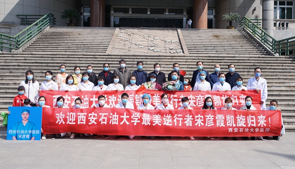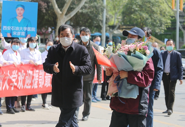 48日上午,宋彥霞護(hù)士結(jié)束了14天的隔離觀察期,從隔離觀察點(diǎn)返回學(xué)校。校黨政領(lǐng)導(dǎo)李天太、張木、蘇文甫,相關(guān)部門負(fù)責(zé)人及校醫(yī)院部分職工在雁塔校區(qū)東門迎接宋彥霞護(hù)士。