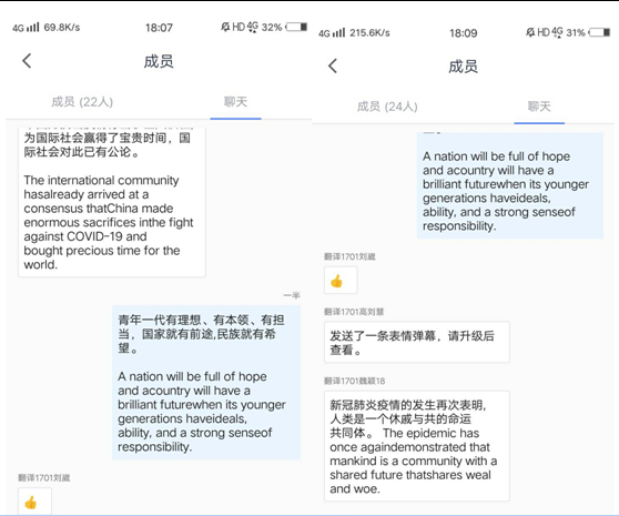 為了激發(fā)學(xué)生學(xué)習(xí)興趣,提升專業(yè)水平,學(xué)院團(tuán)委組織開展了各年級(jí)“雙語(yǔ)學(xué)”主題班團(tuán)會(huì),集體學(xué)習(xí)《中國(guó)日?qǐng)?bào)China Daily》頭條英文播報(bào)中《習(xí)近平總書記給北京大學(xué)援鄂醫(yī)療隊(duì)全體“90后”黨員的回信》雙語(yǔ)版,將總書記給青年的兩篇回信結(jié)合起來(lái)學(xué),要求每位同學(xué)撰寫心得體會(huì),分享交流,做好思想引領(lǐng)與啟迪。