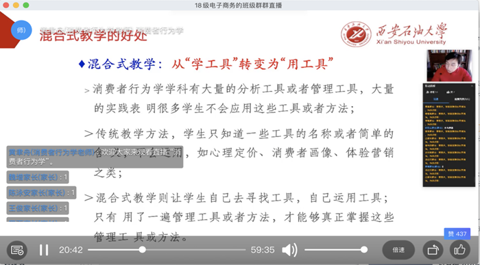 經(jīng)濟(jì)學(xué)系和管理科學(xué)與工程系。為了保障教學(xué)效果,經(jīng)濟(jì)學(xué)系和管科系的老師們也積極踐行“線上”+“線下”的混合式教學(xué)方式,將在線教學(xué)和傳統(tǒng)教學(xué)的優(yōu)勢結(jié)合起來,把學(xué)習(xí)者的學(xué)習(xí)由淺到深地引向深度學(xué)習(xí)。老師們提前制定預(yù)案,從課程準(zhǔn)備、課程資源、課堂教學(xué)、師生互動(dòng)、指導(dǎo)答疑和作業(yè)考評等方面進(jìn)行教學(xué)設(shè)計(jì)和思考。課程多采用多平臺相結(jié)合方式進(jìn)行開展,如中國mooc課程+釘釘直播教學(xué)+釘釘/微信。選用中國mooc平臺的“國家精品課”開展基礎(chǔ)知識學(xué)習(xí);通過釘釘直播,開展與章節(jié)內(nèi)容相關(guān)的消費(fèi)者行為學(xué)問題討論;通過釘釘班級群/微信群,發(fā)布學(xué)習(xí)重難點(diǎn)、作業(yè),保障溝通的及時(shí)性。這種多平臺相結(jié)合的形式,既拓展了學(xué)生自主學(xué)習(xí)能力、鍛煉了學(xué)生學(xué)以致用的思辨能力,更重要的是培養(yǎng)學(xué)生們做“建設(shè)者”的意識,學(xué)生反饋效果良好。