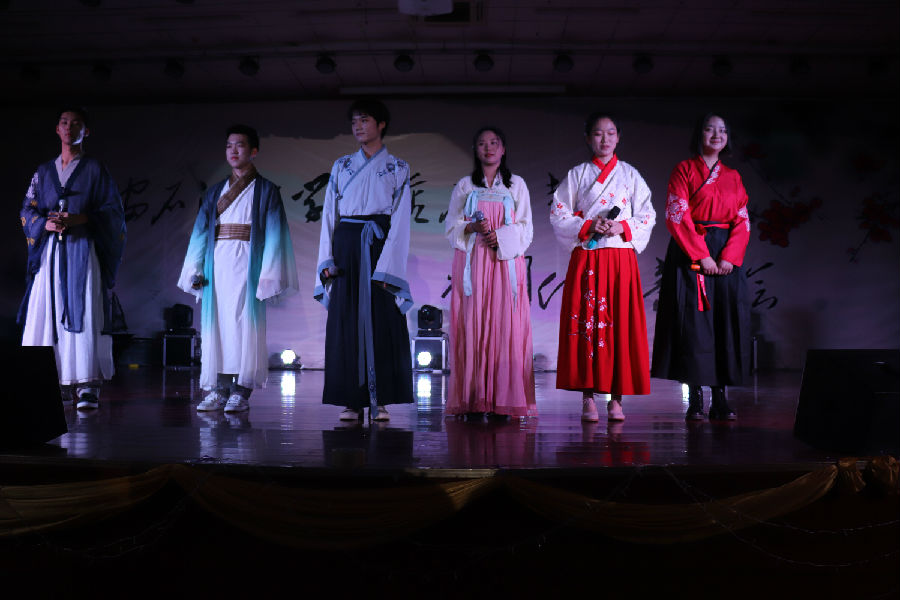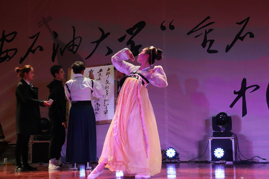接下來音樂會(huì)正式開始。一首婉轉(zhuǎn)悠揚(yáng)的陜北民歌《叫一聲哥哥快回來》將我們帶入傳統(tǒng)民族音樂氛圍中;接著又是動(dòng)態(tài)美與民族美的結(jié)合,哈薩克族的同學(xué)們獻(xiàn)出動(dòng)感十足的民族舞蹈;長(zhǎng)笛與二胡奏出一曲“美麗的神話”;人文學(xué)院與材料學(xué)院同學(xué)合作演出京劇《春閨夢(mèng)》;藏族姑娘卓爾丹舞出莊重優(yōu)美的《轉(zhuǎn)山》,新疆小伙彈著冬不拉唱起《明月思故鄉(xiāng)》……最后,人文學(xué)院盧強(qiáng)老師帶領(lǐng)兩位學(xué)生在動(dòng)聽的中國(guó)古典音樂和舞蹈的背景下?lián)]毫潑墨,創(chuàng)作了精彩的書法作品。