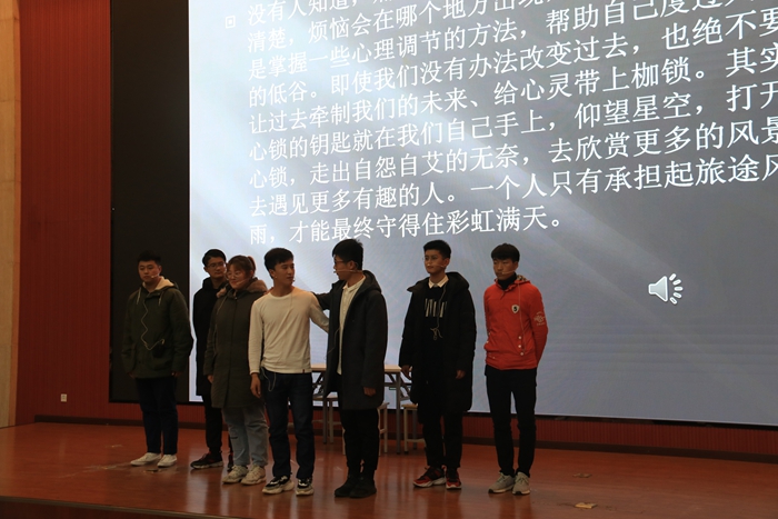 本次匯報演出我校2019年心理育人優(yōu)秀實踐作品的部分成果,外國語學(xué)院心理微電影《你好,嘉絡(luò)》,獲得陜?省高校第三屆校園心理情景劇二等獎,是課程育人的體現(xiàn);心理主題班會《相聚石大,你我同行》《溝通從心開始》,將德育與心育有機融合,體現(xiàn)了管理育人的作用。校園情景劇《解開心鎖》《最好的自己》 利用與現(xiàn)實生活相似的情景,通過行動表達(dá)的方法與技術(shù),重現(xiàn)事情發(fā)生時心理活動現(xiàn)實、內(nèi)心沖突,起到了實踐育人的作用。手語舞《國家》更是寄托了石大學(xué)子對祖國發(fā)展繁榮昌盛的美好祝愿,是今年《心理健康教育》課程的新增的實踐成果。