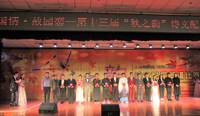 本次比賽的主題是“家國情?故園戀”,經(jīng)過歷時兩個月的班級預賽、院系復賽,最終23組選手進入決賽。經(jīng)過激烈的角逐,最終來自人文學院的《長安之眼》以及石油工程學院的《為國思》榮獲一等獎;化學化工學院的《祖國頌》、經(jīng)濟管理學院的《進擊的中國》等七個節(jié)目榮獲二等獎;來自理學院的《七子之歌》、音樂系的《滿江紅》等十四個節(jié)目榮獲三等獎。