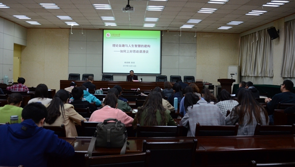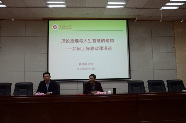 聘任儀式結(jié)束后,賴雄麟教授為馬院師生作了題為《理論旨趣與人生智慧的建構(gòu)——如何上好思政課漫談》的學(xué)術(shù)報告。他從我們?yōu)槭裁葱枰枷胝谓逃⑺枷胝谓逃男再|(zhì)、如何上好思想政治教育三個方面進(jìn)行了精彩地講解,并與參會師生進(jìn)行了互動交流。