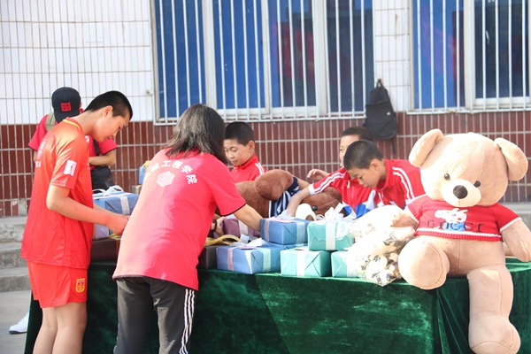 大愛無言,真愛無疆。小朋友們對師生們的到來舉行了熱烈的歡迎儀式,東周兒童村村民委員會(huì)主任楊彪也對大家的到來表示了最熱烈的歡迎和衷心的感謝,并充分肯定了本次活動(dòng)的意義。他表示,這二十多年來,孩子們在和大哥哥大姐姐們相處之后,都逐漸走出了生活的陰影,大都長高了,長胖了,臉上也露出了童年的天真和歡笑。同時(shí),機(jī)械工程學(xué)院黨委書記田黨宏也對小朋友們進(jìn)行了勉勵(lì)和鼓舞,并表示機(jī)械工程學(xué)院的全體師生會(huì)一直將愛心持續(xù)下去。學(xué)生工作部部長趙健和人文學(xué)院黨委書記余小勇代表此行的志愿者把屬于孩子們的心愿禮物親自送到他們的手中。由音樂系和少數(shù)民族的同學(xué)們?yōu)榇蠹規(guī)砹斯艠泛献唷毒艃骸贰洞航ㄔ乱埂贰犊鞓返柠溛鱽砥铡贰锻米游琛返染始姵实墓?jié)目,全體師生與孩子們一起互動(dòng),共同聯(lián)歡,一同沉浸在這愛的海洋里。