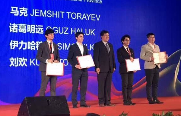省教育廳廳長(zhǎng)王建利為我校留學(xué)生馬克(右一)頒發(fā)證書