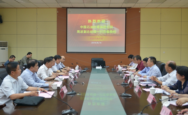周波副總經(jīng)理對我校近年來取得的成績表示祝賀,并簡要介紹了吐哈油田公司的基本情況,希望通過此次交流與我校在儲層剩余油分布、儲層改造和三次采油等新技術方面進一步加強合作。