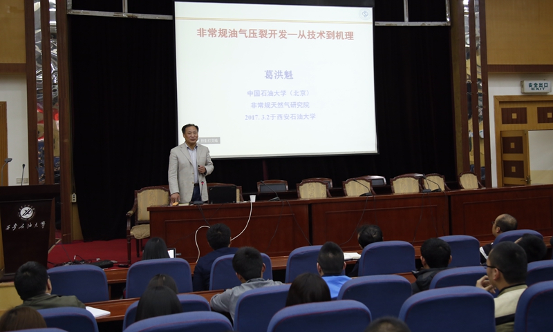 3月2日下午,中國石油大學(xué)(北京)二級教授葛洪魁在學(xué)術(shù)報(bào)告廳為我校師生作了題為《非常規(guī)油氣壓裂開發(fā)——從技術(shù)到機(jī)理》的學(xué)術(shù)報(bào)告。李天太副校長出席報(bào)告會(huì)??萍继庁?fù)責(zé)人及300余名師生聽取了報(bào)告。