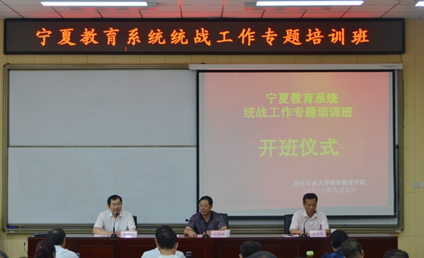 9月5日上午,由寧夏回族自治區(qū)教育工委主辦、我校繼續(xù)教育學(xué)院承辦的“寧夏教育系統(tǒng)統(tǒng)戰(zhàn)工作專題培訓(xùn)班”在南區(qū)培訓(xùn)中心舉行了開班儀式。寧夏教育工委副書記趙建峰、寧夏教育工委黨建工作部部長(zhǎng)孫金忠,我校副校長(zhǎng)李天太以及來自寧夏教育系統(tǒng)的50余名統(tǒng)戰(zhàn)干部參加了開班儀式。