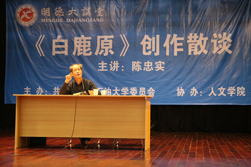 明德大講堂是校團委為活躍校園文化、提升大學生綜合素養(yǎng)而舉辦的一項特色活動,很受師生歡迎。2010年4月15日,陳忠實走進新校區(qū)做客明德大講堂,以《我的讀書生活》為題,為師生講述了趙樹理、柳青、柯切托夫、莫泊桑等一批作家對自己讀書生活的影響,同時肯定了歐洲古典主義文學、現(xiàn)實主義文學、魔幻現(xiàn)實主義、蘇聯(lián)文學對自己藝術(shù)創(chuàng)作的積極影響。先生用濃濃的陜西方言,結(jié)合《白鹿原》的創(chuàng)作歷程,講述了自己多年來的寫作感悟和體會,表達著自己對黃土地的眷戀和熱愛,同時他還建議同學們在學習之余要多讀名著、鑒賞藝術(shù)品,注重視生活細節(jié),這樣在創(chuàng)作時便可直接進入生活。言之切,情之深,先生的講座讓聽者動容。