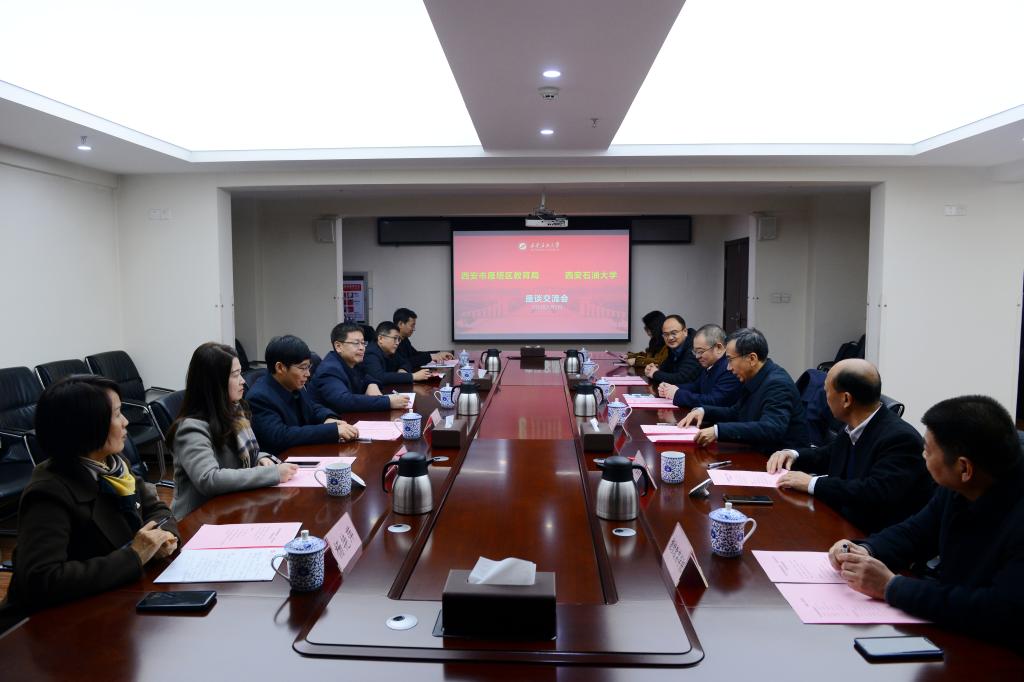 樊銘瑞對(duì)我校的熱情接待表示感謝,他介紹了雁塔區(qū)教育的基本情況以及雁塔區(qū)作為西安市教育大區(qū)的使命和擔(dān)當(dāng)。他表示,西安石油大學(xué)是雁塔區(qū)內(nèi)的知名高校,學(xué)校的發(fā)展成就也是雁塔區(qū)教育事業(yè)的重要組成部分。雁塔區(qū)教育局愿意與學(xué)校進(jìn)一步深化合作,充分依靠西安石油大學(xué)的多學(xué)科辦學(xué)優(yōu)勢(shì)支撐雁塔教育事業(yè)發(fā)展,積極幫助解決學(xué)校教職工子女教育的后顧之憂(yōu),實(shí)現(xiàn)優(yōu)勢(shì)互補(bǔ),共同推動(dòng)雁塔區(qū)從教育大區(qū)向教育強(qiáng)區(qū)的邁進(jìn)。