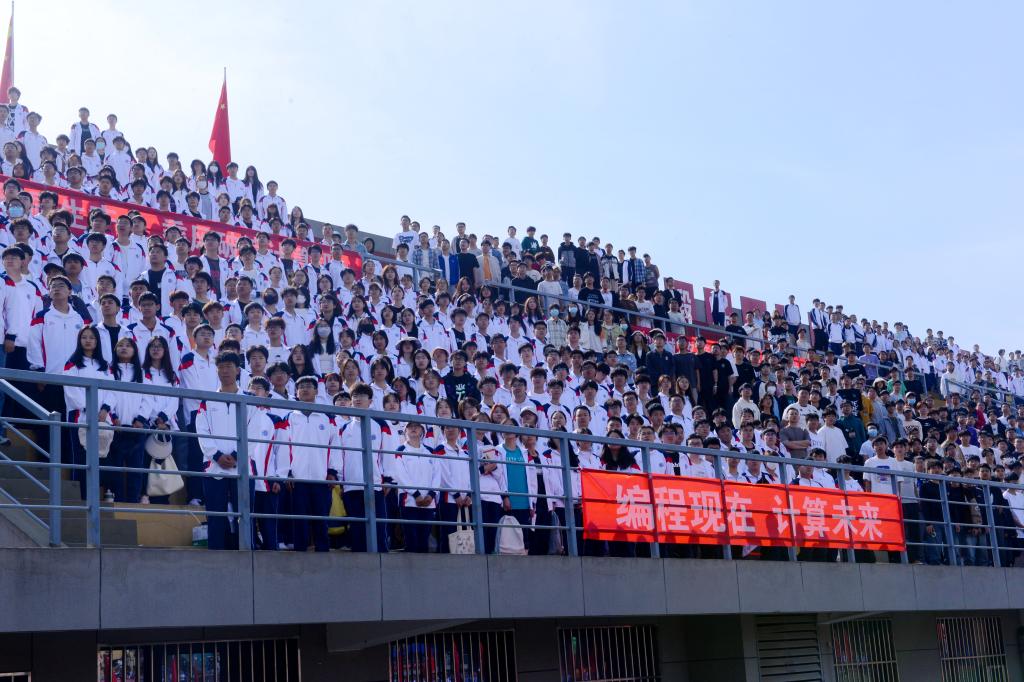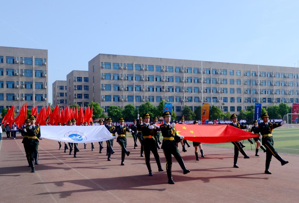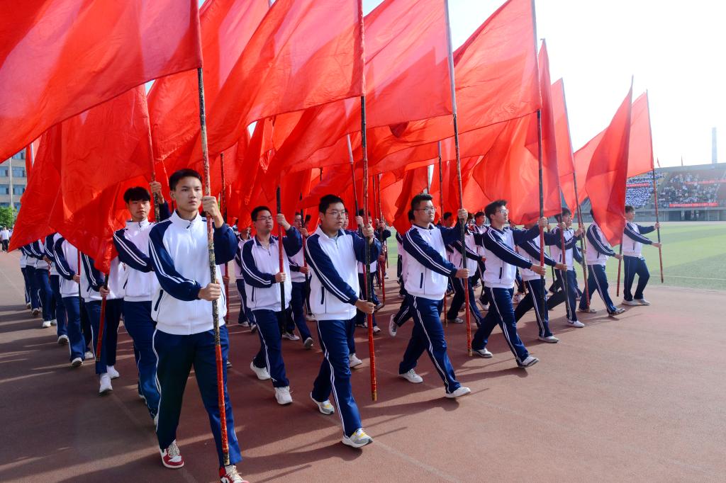 入場儀式完畢,全場起立。在雄壯的國歌聲中,大會舉行了莊嚴(yán)的升旗儀式,隨著五星紅旗冉冉升起,全場師生齊唱國歌。