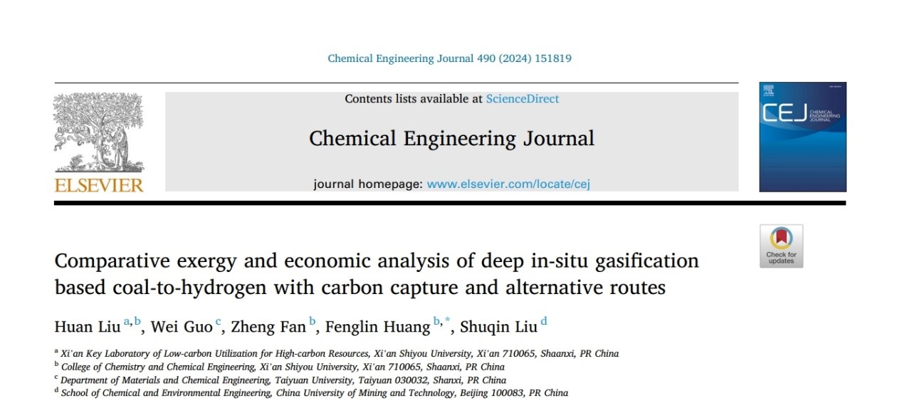 近日,我校化學(xué)化工學(xué)院黃風(fēng)林科研團(tuán)隊(duì)以青年教師劉歡為第一作者、黃風(fēng)林為通訊作者,西安石油大學(xué)為第一署名單位在工程技術(shù)與化工領(lǐng)域最有影響力的三大頂級(jí)刊物之一《Chemical Engineering Journal》(JCR、中科院分區(qū)雙一區(qū)TOP期刊,IF=15.1)上發(fā)表題為《Comparative exergy and economic analysis of deep in-situ gasification based coal-to-hydrogen with carbon capture and alternative routes》的高水平論文。