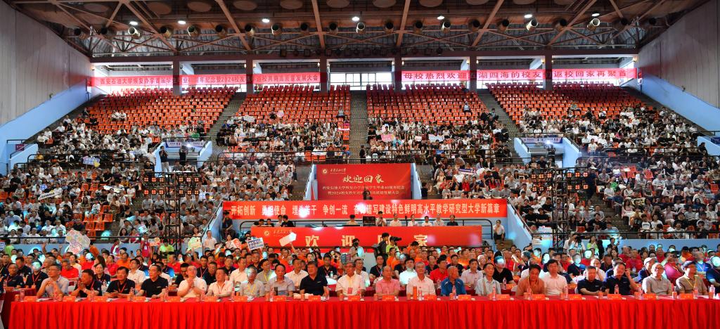 7月27日上午,學(xué)校在雁塔校區(qū)體育館隆重舉行了恢復(fù)辦學(xué)首屆學(xué)生畢業(yè)40周年紀(jì)念暨2024校友秩年返校共商高質(zhì)量發(fā)展大會。學(xué)校黨政領(lǐng)導(dǎo)常江、王進(jìn)富、張木、王輝強(qiáng)、程永清、楊戰(zhàn)社、張榮軍、張君濤、張驍勇、趙健、樊曉民出席會議,校友代表、校友家屬、各地校友分會負(fù)責(zé)人代表、校友企業(yè)家聯(lián)合會代表、歷任校領(lǐng)導(dǎo)代表,各職能部門和院(系)負(fù)責(zé)人、教師代表和在校生代表共計1200余人參加會議。