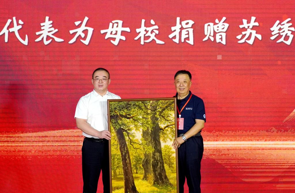 廠80級校友崔曉明為母校捐贈蘇繡《三棵樹》,表達(dá)對母校的祝福,常江代表學(xué)校接受捐贈,感謝80級校友對母校的深厚情誼。
