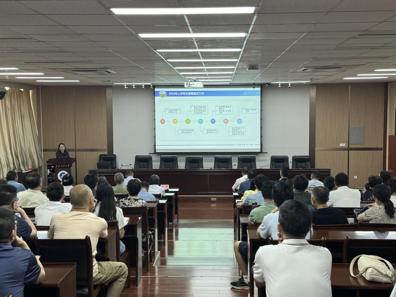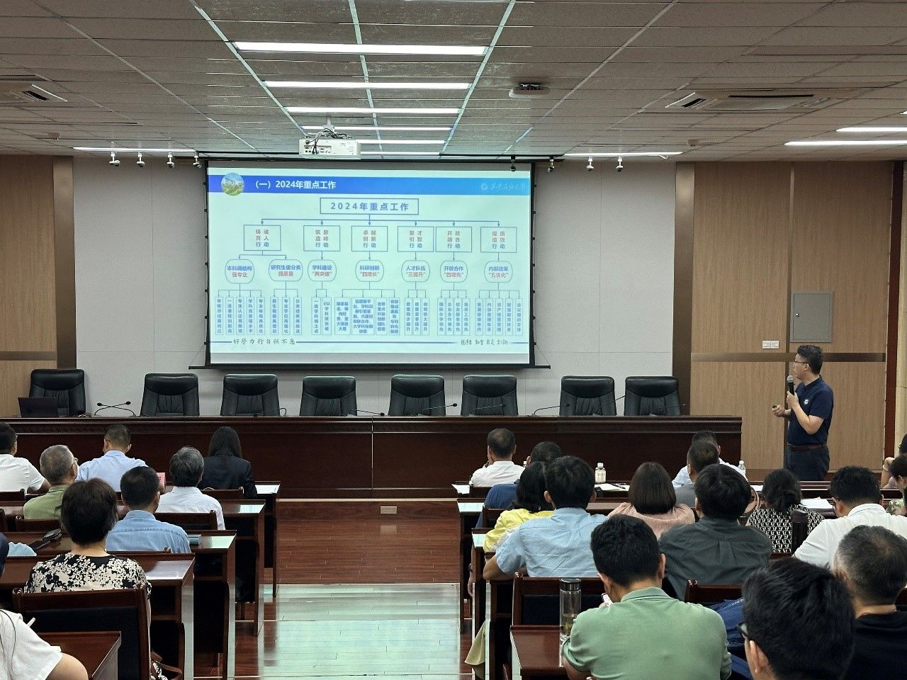 院長李飛作了關(guān)于學(xué)院發(fā)展現(xiàn)狀分析和下半年發(fā)展規(guī)劃的報告,圍繞學(xué)科建設(shè)、科研工作、人才培養(yǎng)、師資隊伍建設(shè)等方面,通過縱向、橫向數(shù)據(jù)對比分析學(xué)院近年來指標(biāo)性數(shù)據(jù),詳細(xì)剖析了學(xué)院現(xiàn)狀和制約發(fā)展的短板、弱項。