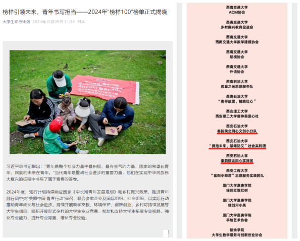 近日,團中央學(xué)校部揭曉了2024年“榜樣100”全國優(yōu)秀大學(xué)生團隊及社團榜單,我校秦韻陜北同心文創(chuàng)小分隊、“擁抱未來,禁毒防艾”社會實踐團、秦韻陜北同心實踐團三支團隊入選“榜樣100”全國優(yōu)秀大學(xué)生團隊”。